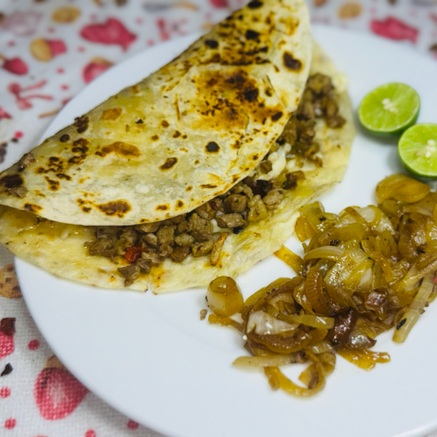 TORTILLA DE HARINA JUMBO INCLUYE QUESO CHIHUAHUA CEBOLLA ASADA LIMON Y SALSAS VERDE Y ROJA