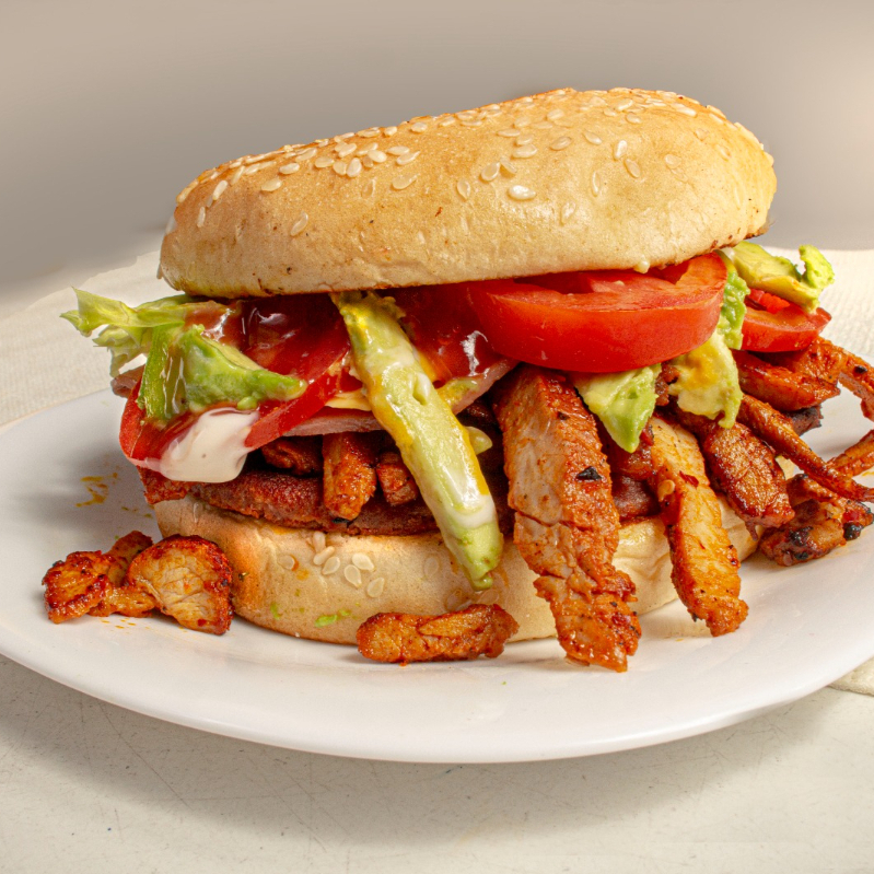 PAN CARNE DE PASTOR INCLUYE PAPAS ALA FRANCESA JAMON QUESO AMARILLO LECHUGA TOMATE CATSUP MAYONES MOSTAZA CHILES EN VINAGRE