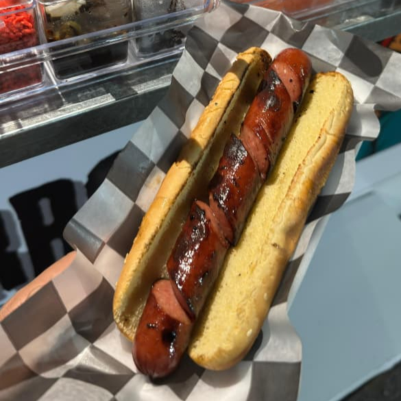 Salchicha para asar de 25cm en pan jumbo, preparado con aderezos y toppings de tu preferencia.