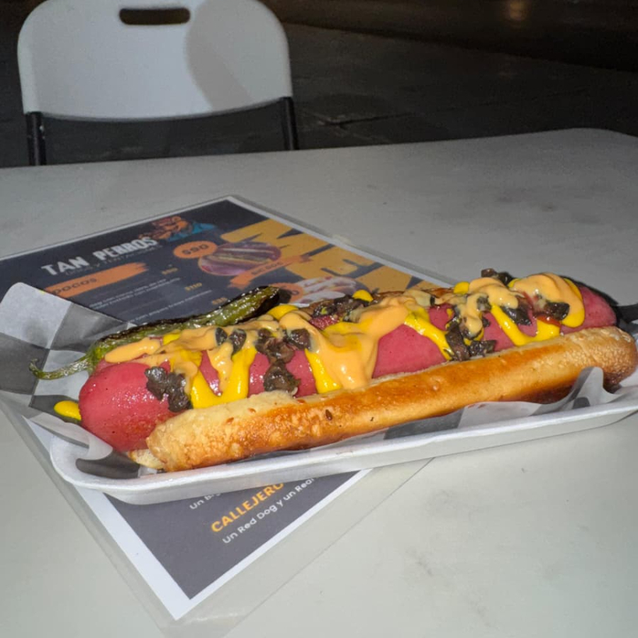Salchicha de pavo de 25cm en pan jumbo, preparado con aderezos y toppings de tu preferencia.