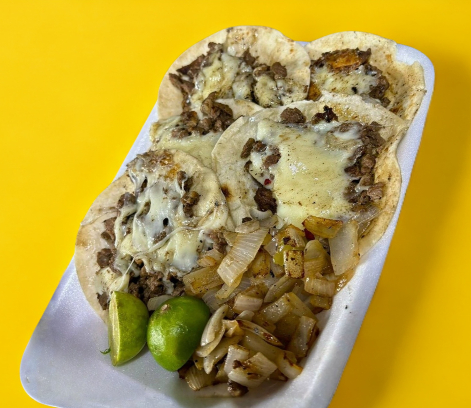 5 tacos de bistec en harina con costra de queso Chihuahua acompañados de cebolla asada, limones y salsas taqueras