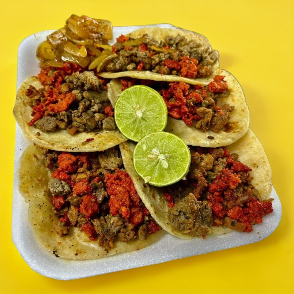5 Tacos en tortilla de harina de carne al pastor y bisteck combinados y con costra de queso, acompañados de cebollita cocida