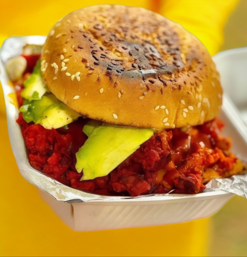 150gr de carne de res, 150gr de carne al pastor, aderezos, aguacate y cebolla caramelizada INCLUYE PAPAS A LA FRANCESA!