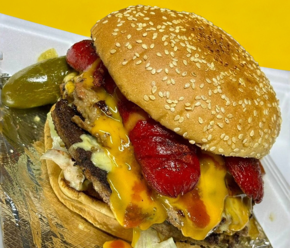150gr de carne de res, 1 salchicha parrillera asada, costra de queso chihuahua, aguacate y cebolla caramelizada INCLUYE PAPAS A LA FRANCESA!