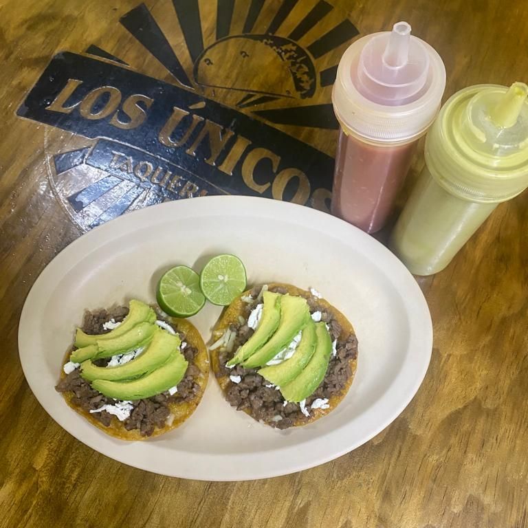 Tostada, queso para derretir, bisteck, aguacate y queso panela