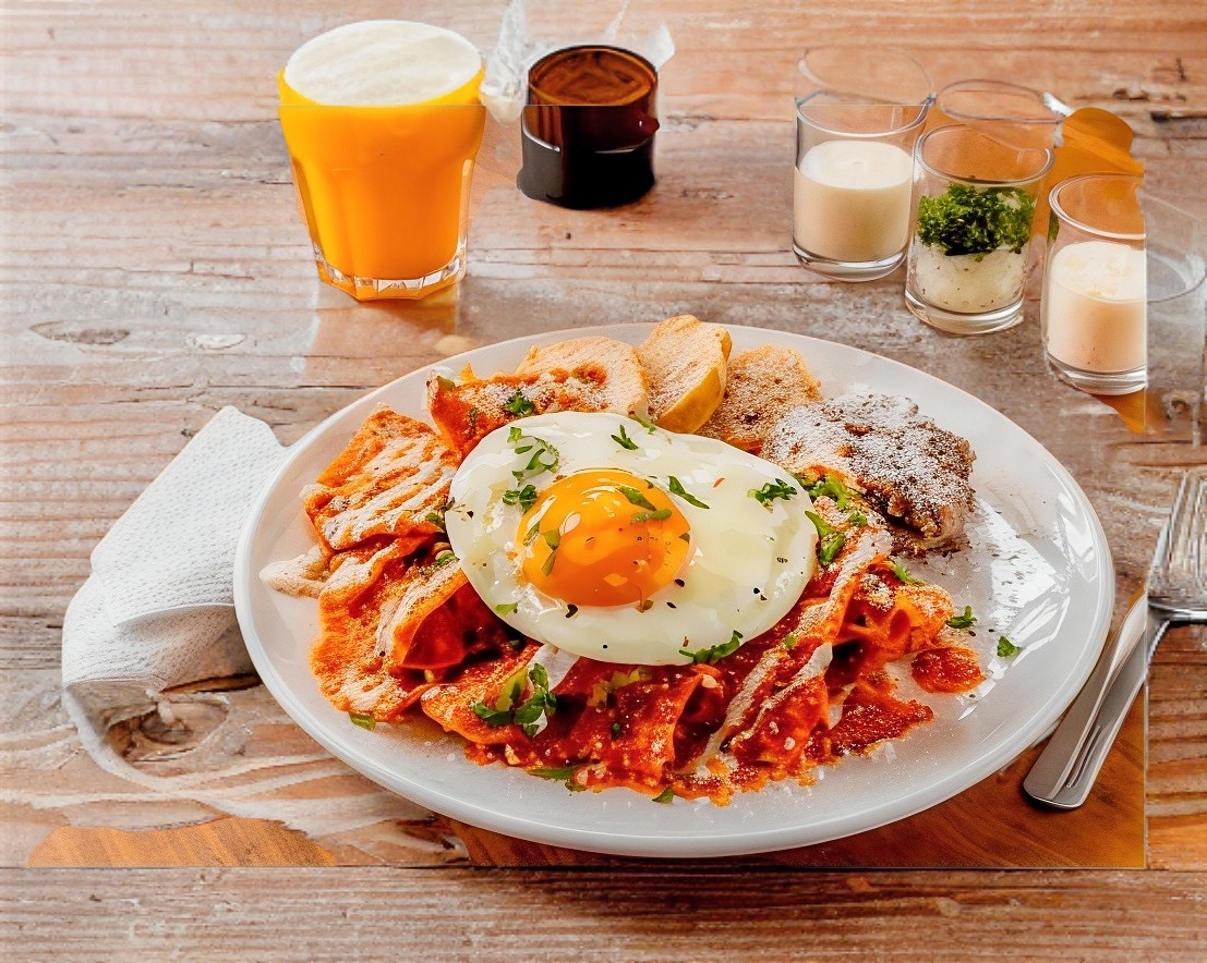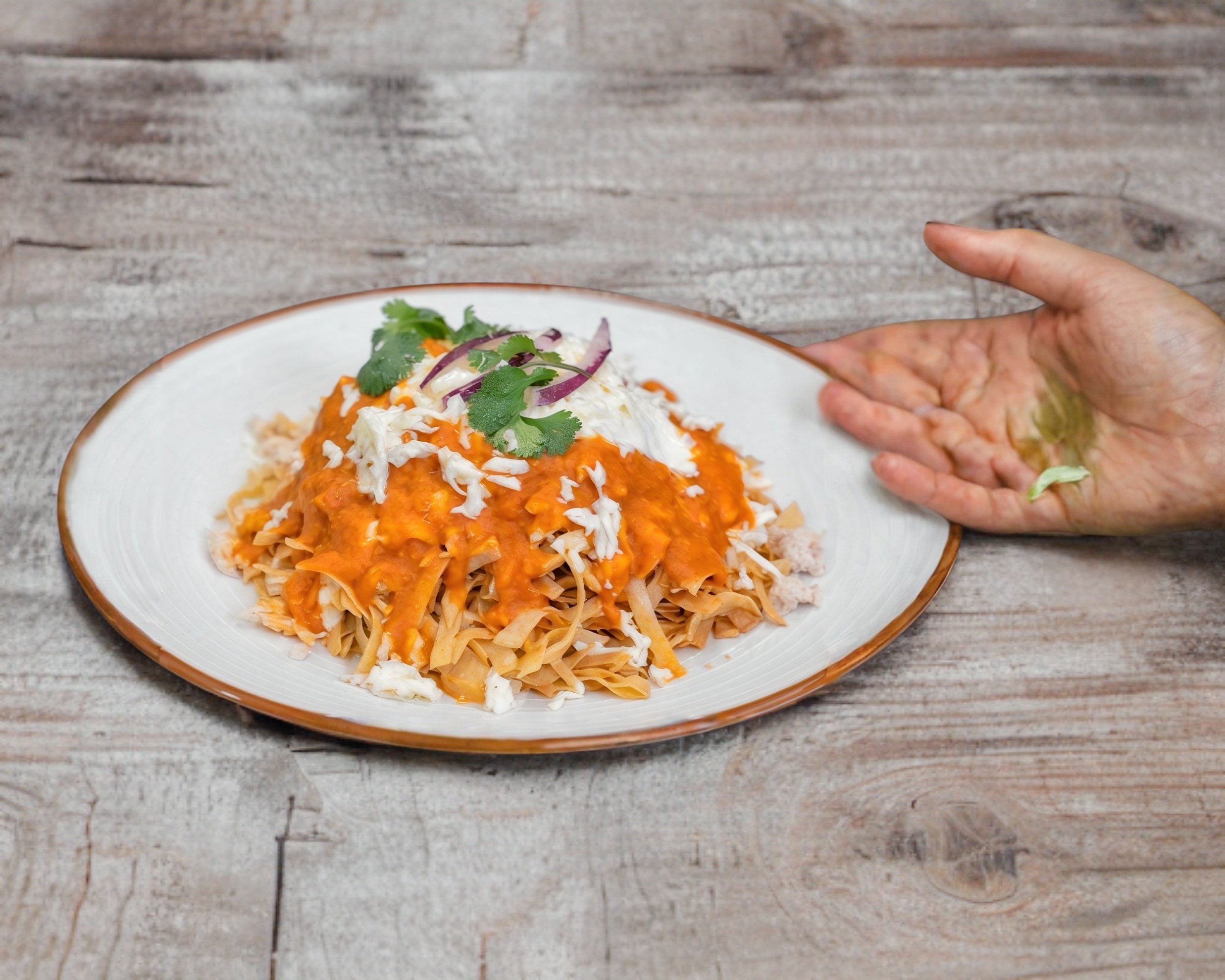 80gr gramos Tortilla en cuadros bañada en salsa a tu elección y queso. Se acompañan de frijoles