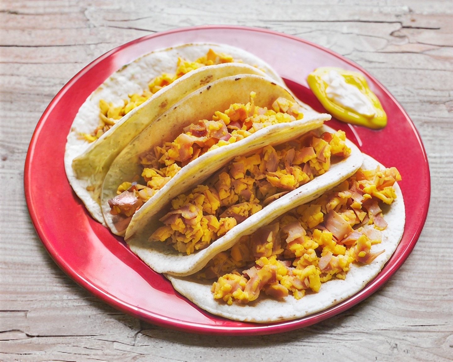 Tacos en tortilla a elegir con guiso de huevo y salsa roja.