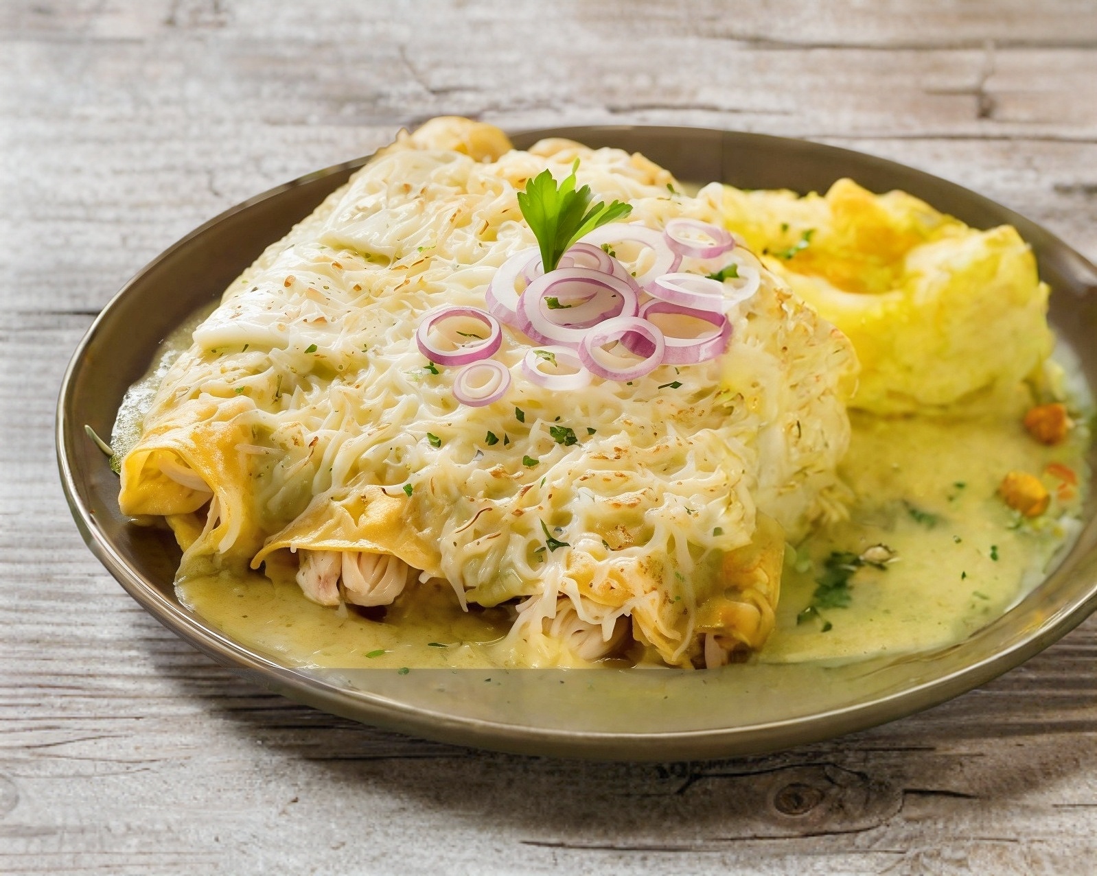 4 Enchiladas rellenas de pollo y bañadas en salsa de tomatillo y queso gratinado, se acompaña de frijol refritos