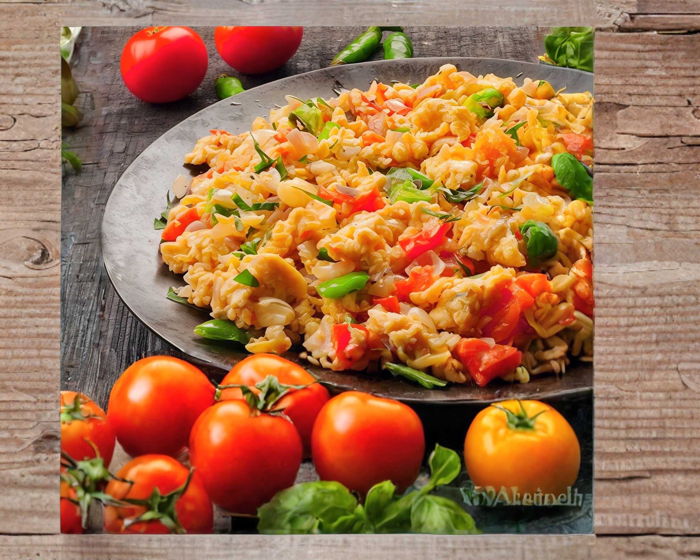 Huevo revuelto guisado con pico de gallo (chile, tomate y cebolla), se acompaña de frijoles refritos.
