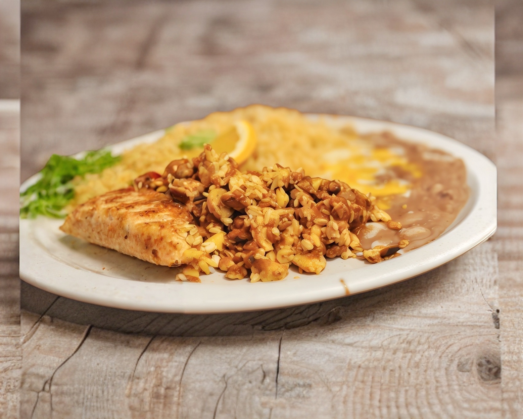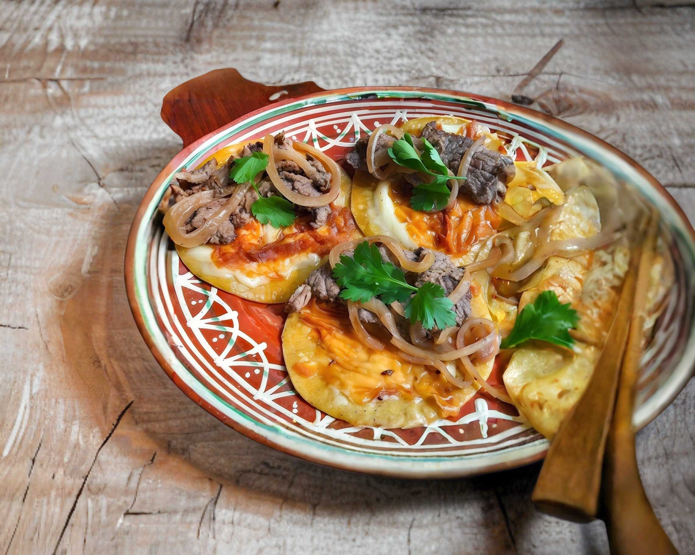Bistec en trozos, bañado en salsa de la casa y cebolla dorada a la sartén, se acompaña de frijoles refritos y orden de 4 tortillas de maiz