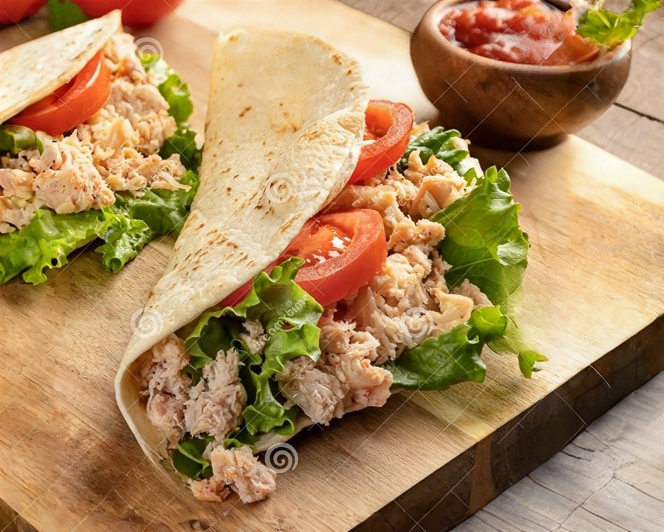 4 Tortillas de harina con pollo, tomate y lechuga.