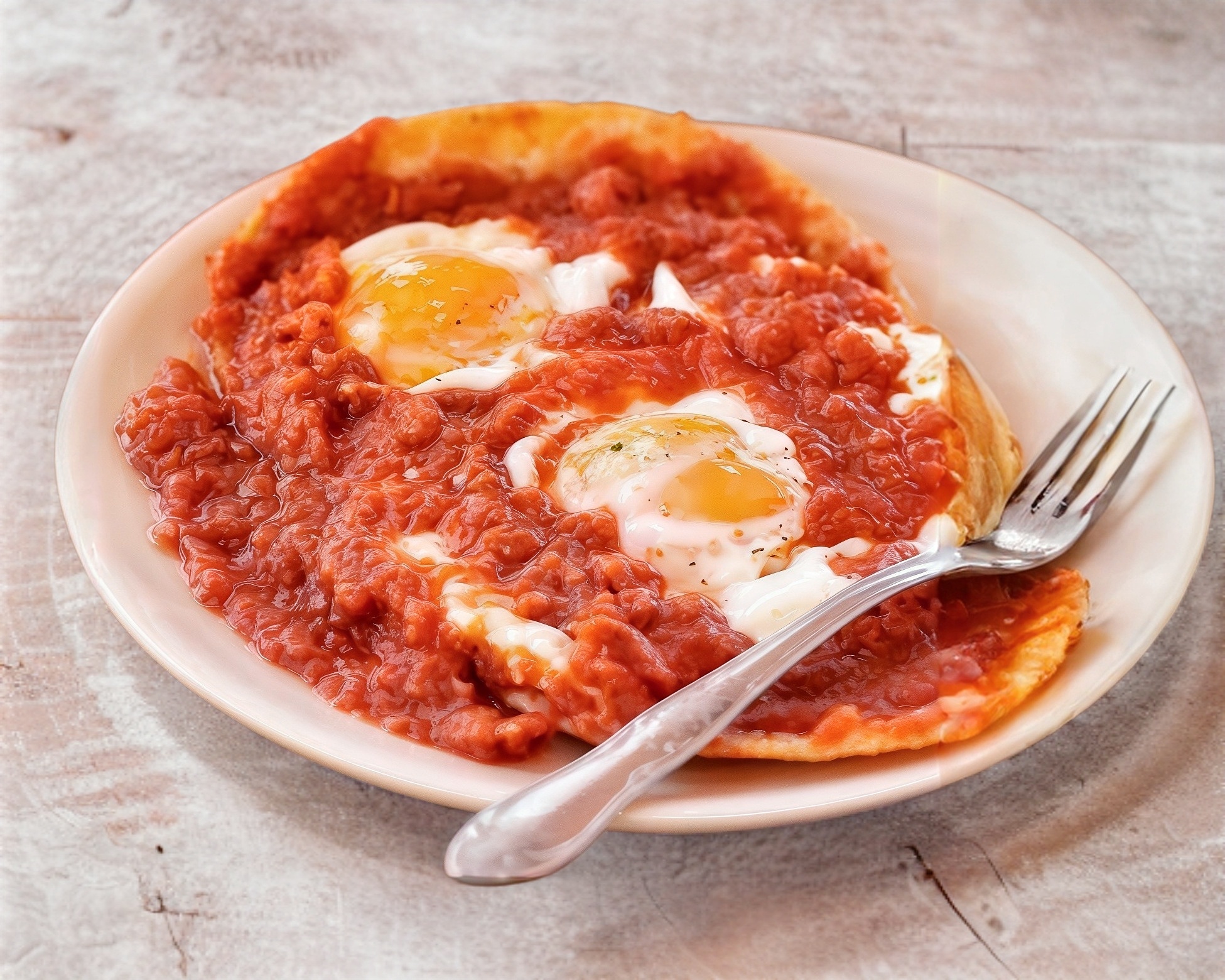 2 Huevos estrellados bañados en salsa picante, frijoles refritos y jamón a la plancha.