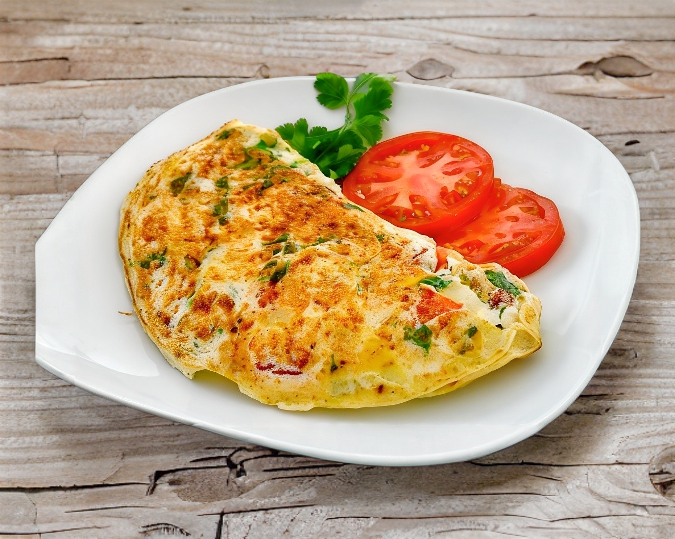 Dos piezas de huevo revuelto con trozos de tocino y se acompaña de frijoles