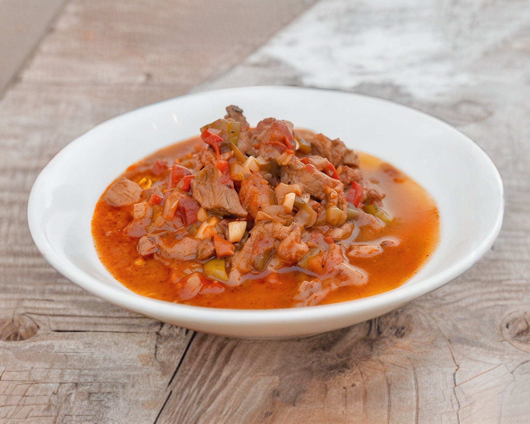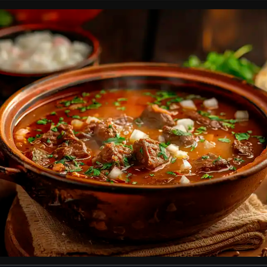 Menudo de res con chile colorado y especias. Se acompaña de verdura y tortillas