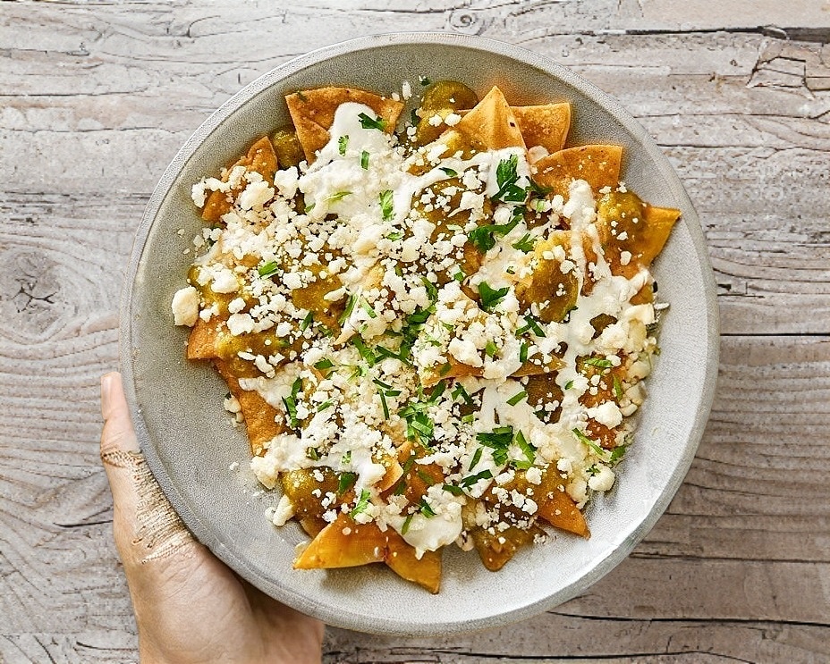 80 gramos Totopo bañados en salsa verde de la casa y queso, se acompaña de frijoles refritos.