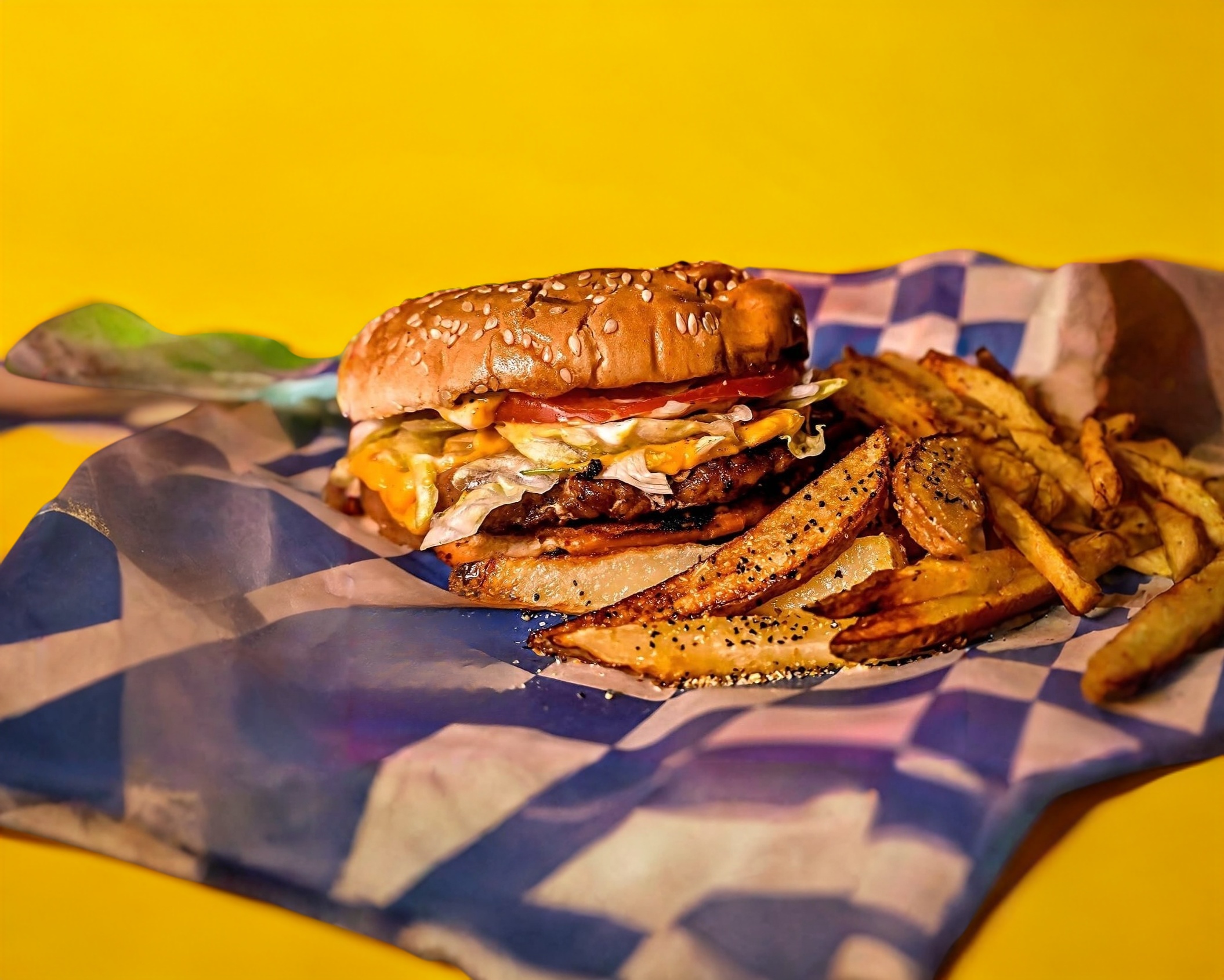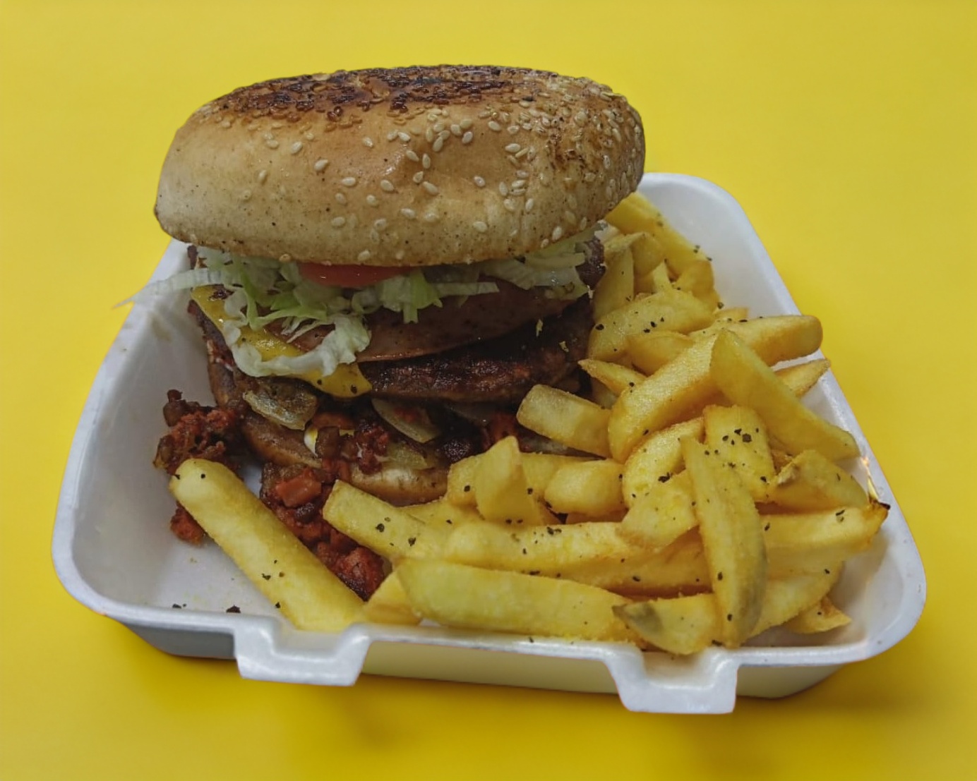 Carne 100% casera, lechuga, tomate, jamón, queso y aderezos