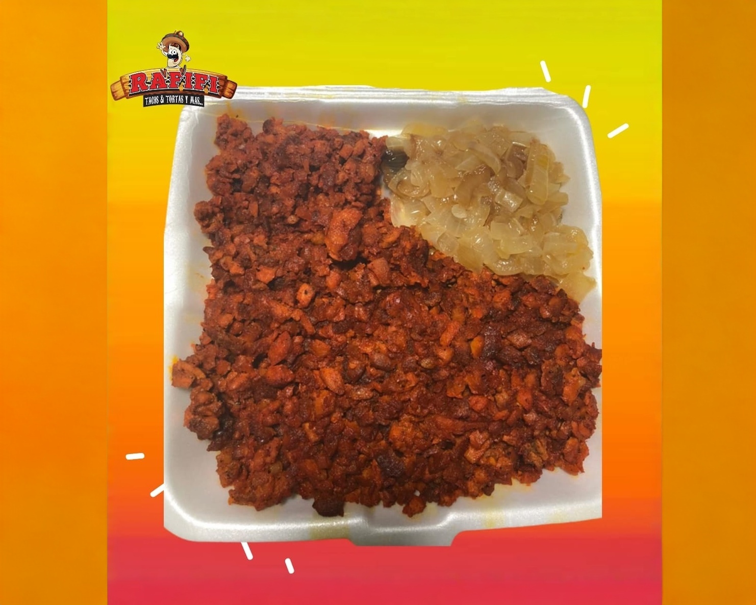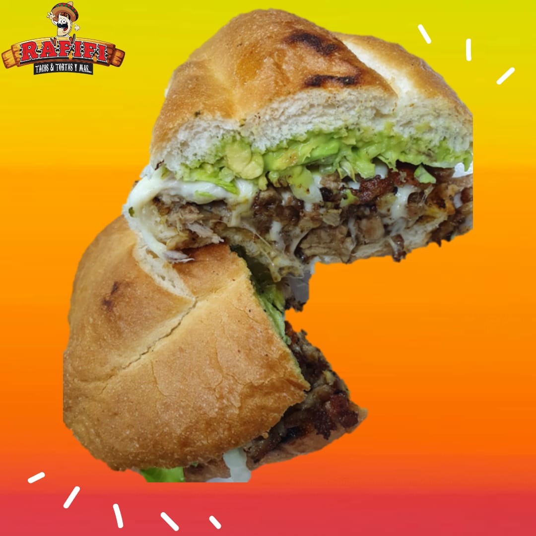 Carne 100% casera, bistec, pastor, lechuga, tomate, cebolla asada, jamón, queso y aderezos