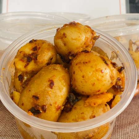1/2 litro de papita cambray bañada, en matequilla, limon y chile seco morita