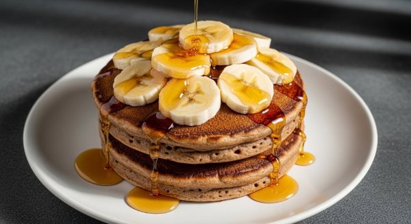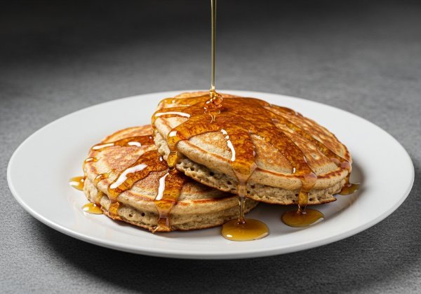 Deliciosos pancakes de avena y esponjosos acompañados de dulce de jarabe de maple.