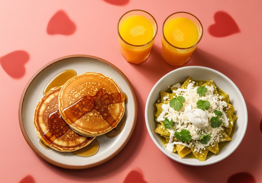 Celebra el amor y la amistad con nuestro combo especial para compartir que incluye: 1 Pancakes tradicionales, 1 Chilaquiles Verdes y un jugo de naranja. ¡El equilibrio perfecto entre dulce y salado!