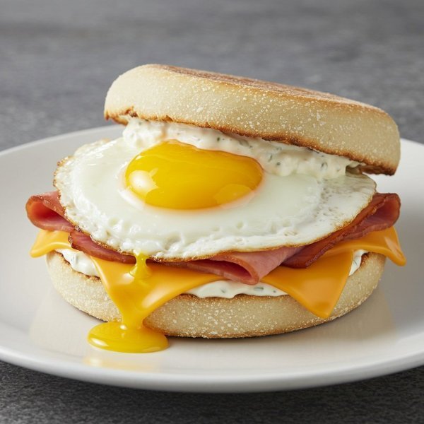 English muffin con huevo estrellado crujiente tocino y queso cheddar derretido. Un clásico irresistible para empezar el día.