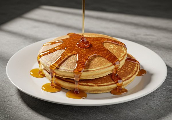 Deliciosos pancakes esponjosos acompañados de jarabe de maple.