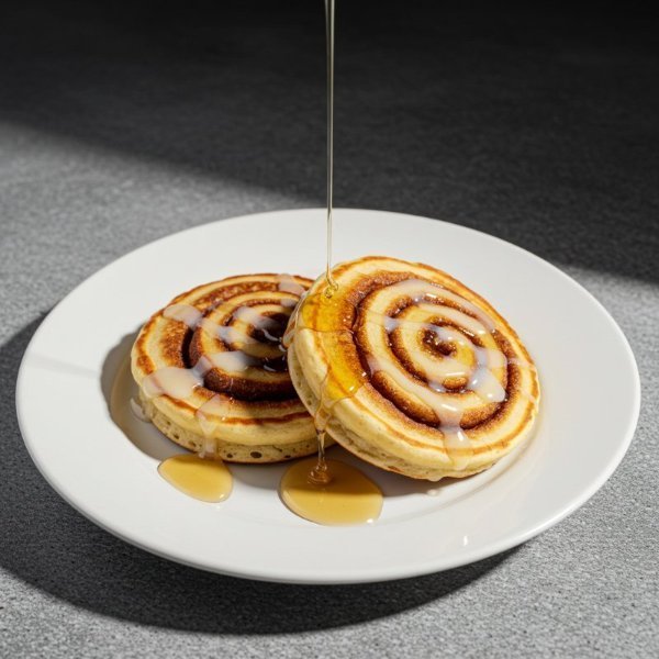 Nuestros deliciosos pancakes convertidos en rollo de canela con canela azúcar glaseado y jarabe de maple por separado.