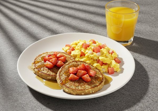 Combo que incluye nuestros famosos pancakes de avena acompañados de miel y fresas frescas huevos revueltos con jitomate y cebolla y bebida a elección.