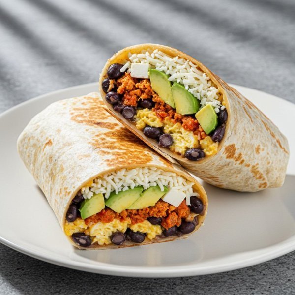 Deliciosos burrito relleno de huevo chorizo frijoles queso derretido y aguacate fresco.