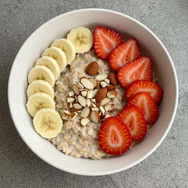 Bowl de avena preparada (canela, miel, chia,yogur) acompañado de fresas, rodajas de plátano y crujientes almendras. (180 gr.)