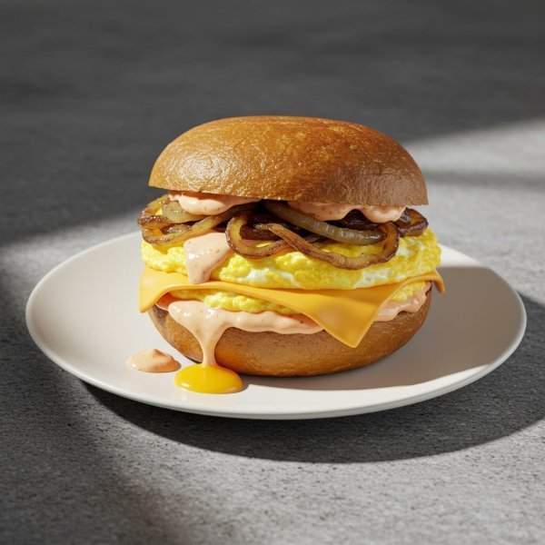 Sándwich en pan de papa con huevo revuelto, queso cheddar, cebolla asada y salsa de la casa.