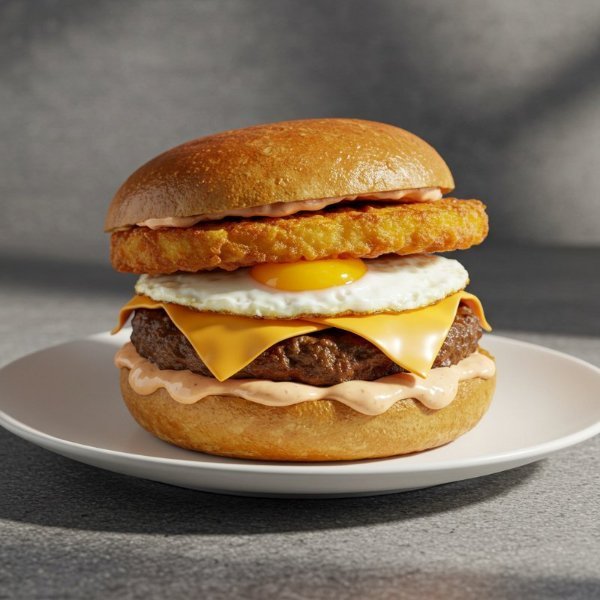 Sándwich en pan de papa con huevo estrellado, carne de hamburguesa, queso cheddar, hash brown y salsa de la casa.