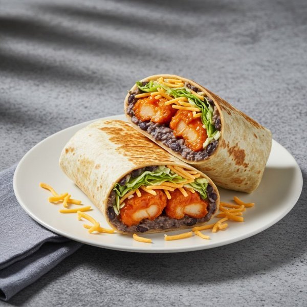 Delicioso burrito relleno de frijoles refritos lechuga fresca queso cheddar y trozos de milanesa de pollo empanizada bañados en nuestra salsa buffalo.