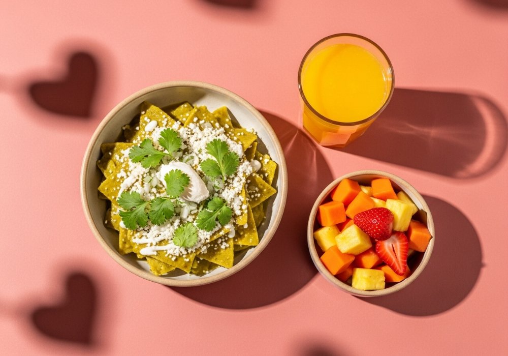 Celebra el amor y la amistad con nuestro combo especial: 1 Chilaquiles Verdes (Crema, queso,cebolla y cilantro), una porción de fruta(fresa, papaya y piña) y un jugo de naranja.