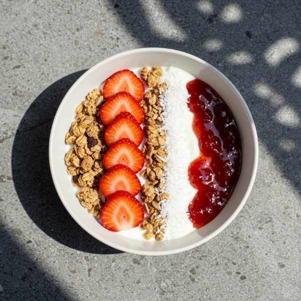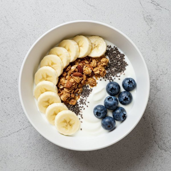 Deliciosa base de yogurt acompañada de granola casera plátano fresco arándanos jugosos y un toque de chía.