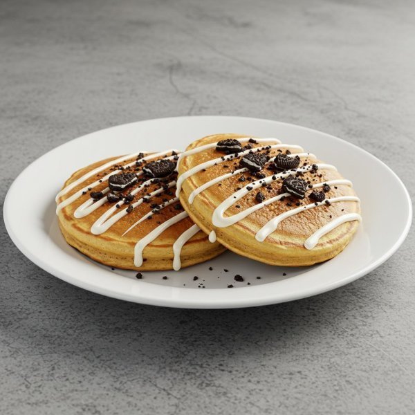 Esponjosos pancakes con trocitos de galleta Oreo cubiertos con frosting de queso crema y yogur.
