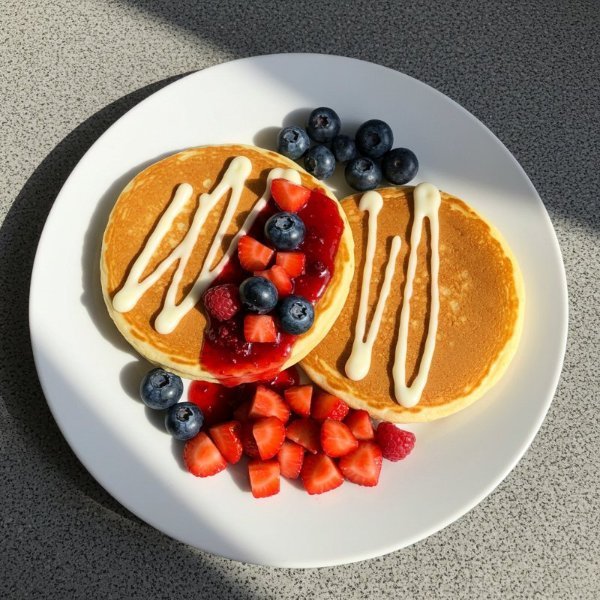 Pancakes recién hechos acompañados con nuestra mezcla de cheesecake, salsa de frutos rojos, fresa y blueberries.