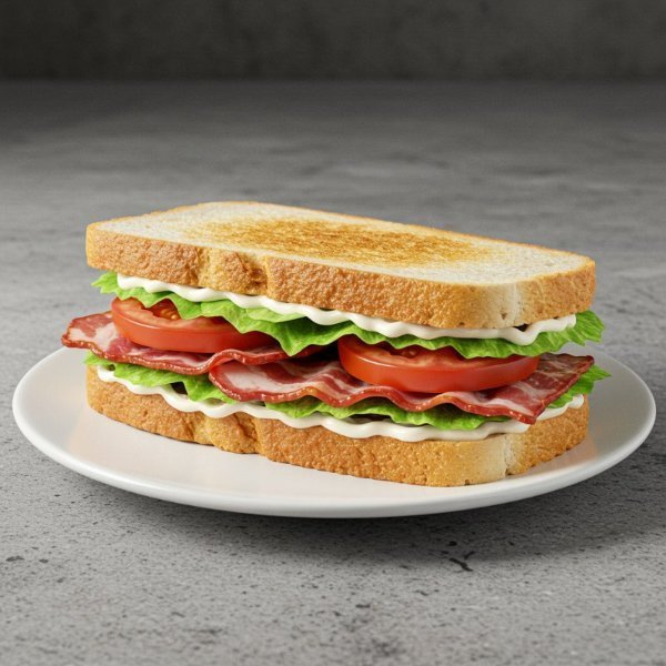 Sándwich de pan toscano con mayonesa crujiente tocino jitomate fresco y lechuga creando una combinación clásica y deliciosa.