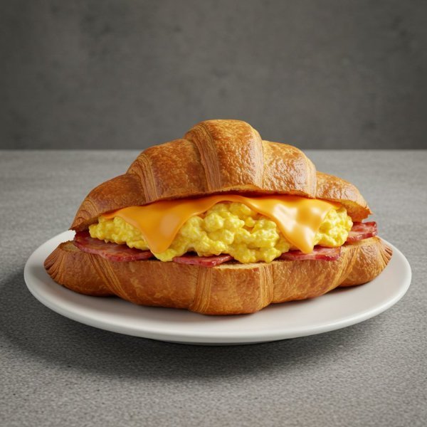 Pieza de croissant recién horneado con huevo revuelto queso cheddar derretido y crujiente tocino.