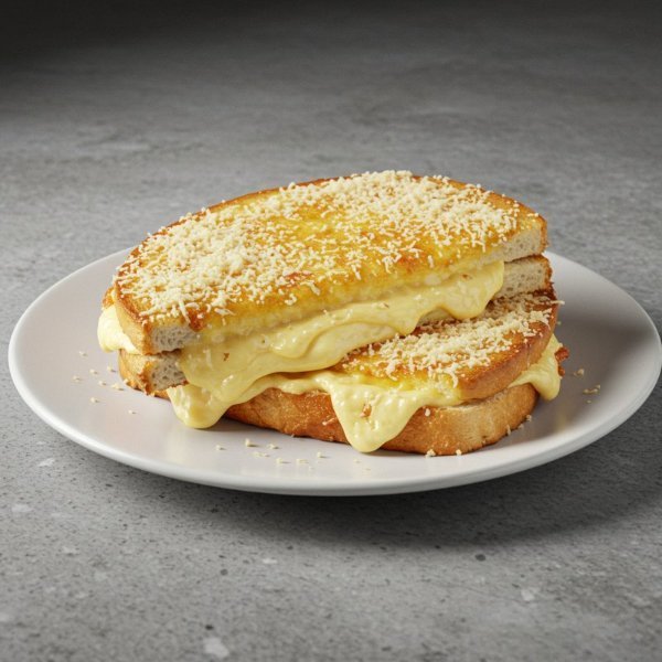 Irresistible sandwich con queso cheddar y mozzarella derretidos envuelto en una costra dorada y crujiente de parmesano.