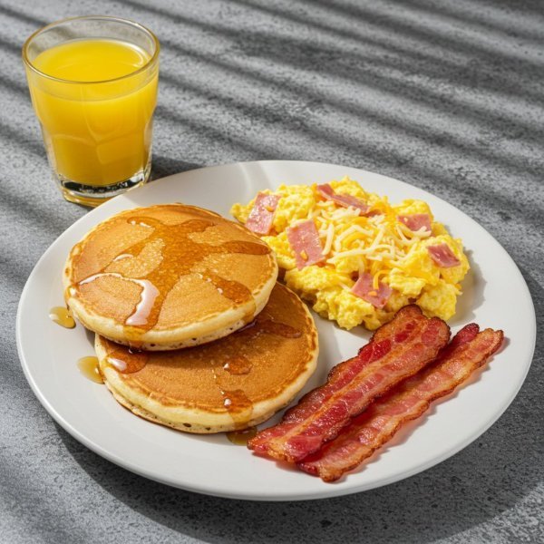 Combo con una porción de pancakes tradicionales, 2 huevos revueltos sencillos, tocino crujiente y una bebida a elección.