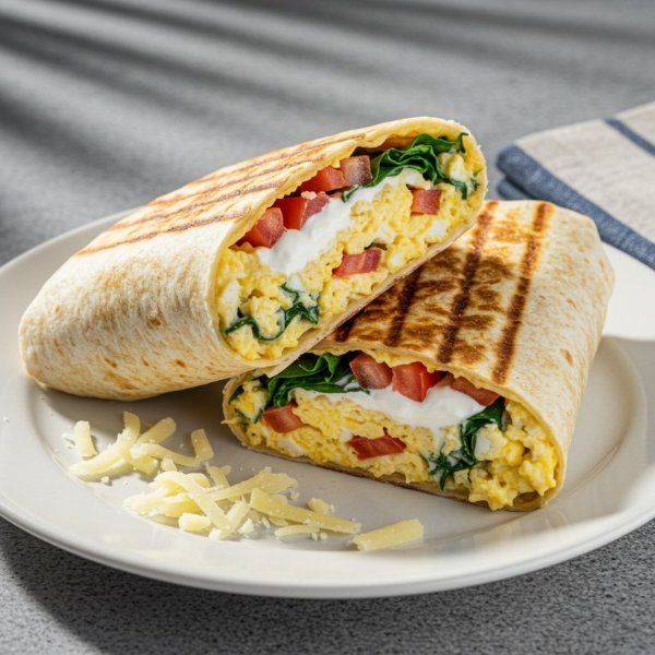 Burrito en tortilla de harina relleno de queso mozzarella espinaca fresca jitomate queso parmesano y huevo revuelto. Todo perfectamente complementado con un toque de crema.