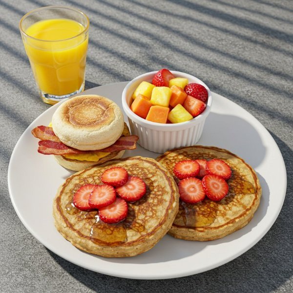 Combo delicioso que incluye una porción de nuestros famosos pancakes de avena,un muffin con huevo y tocino, una porción de fruta y un jugo de naranja.