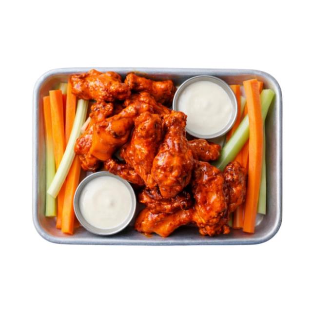 Alitas doradas (500g en crudo), bañadas en tu salsa favorita, con apio y zanahoria de complemento.