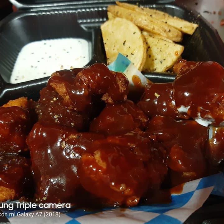 8 a 10 pzs bañados en salsa BBQ, papas fritas y aderezo ranch.