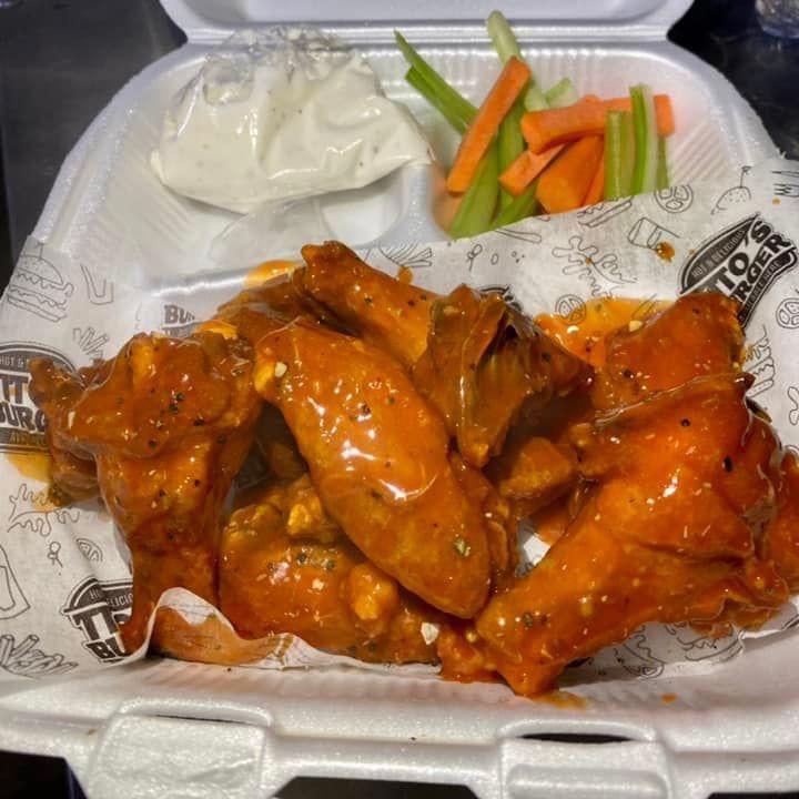 8 a 10 pzs bañados en salsa búfalo, papas fritas y aderezo ranch..