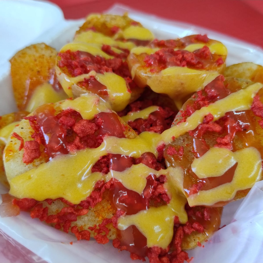 Mantequilla, especies, queso amarillo derretido, un poco de tocino y catsup