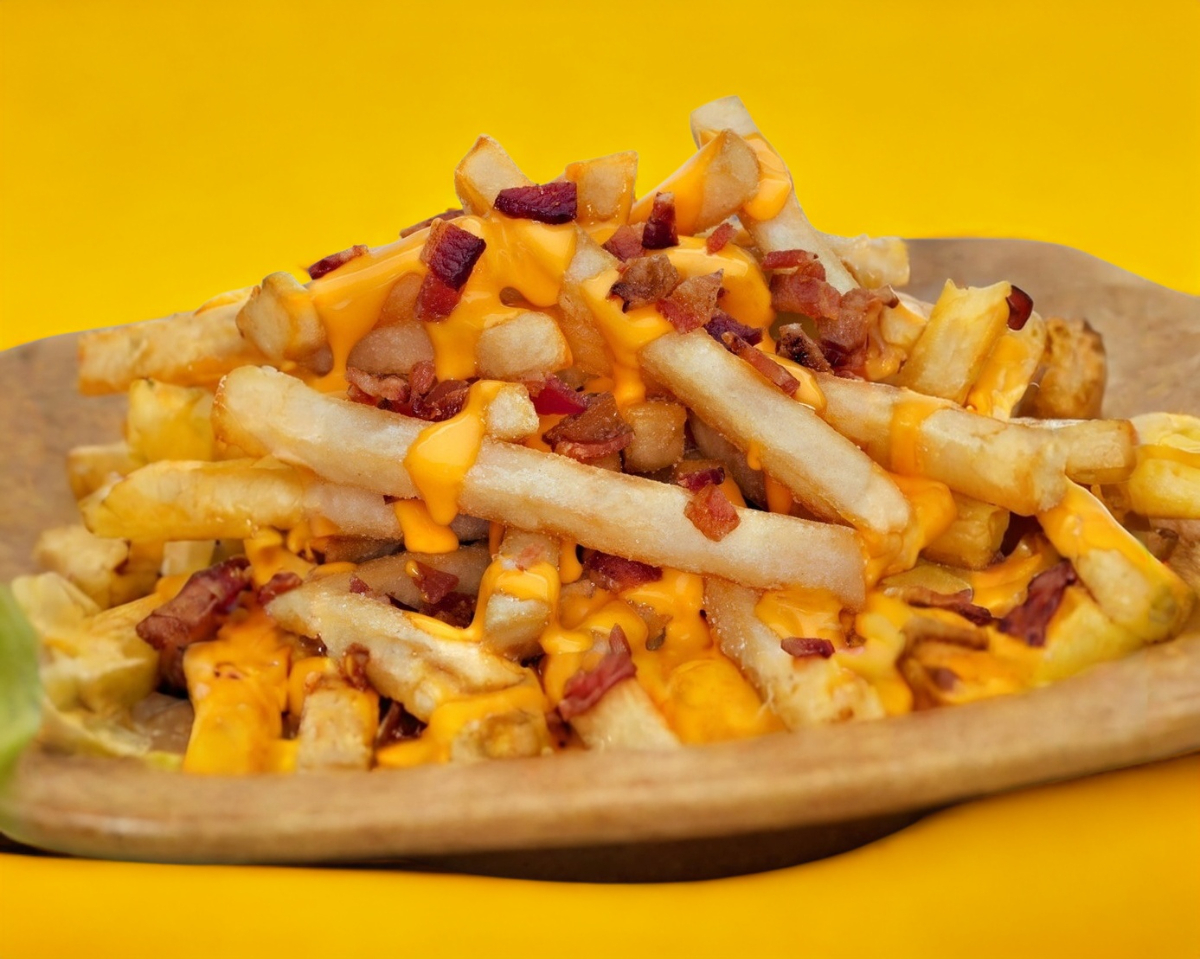 150 gr de papas a la francesa acompañadas con queso cheedar fundido acompañado con tocino en trocitos