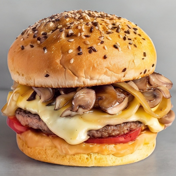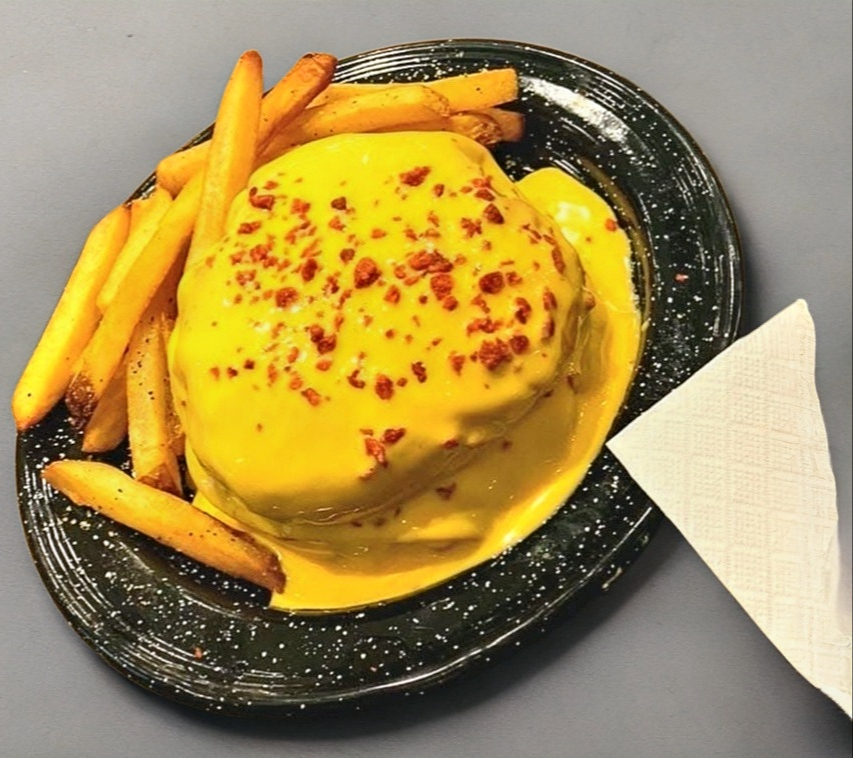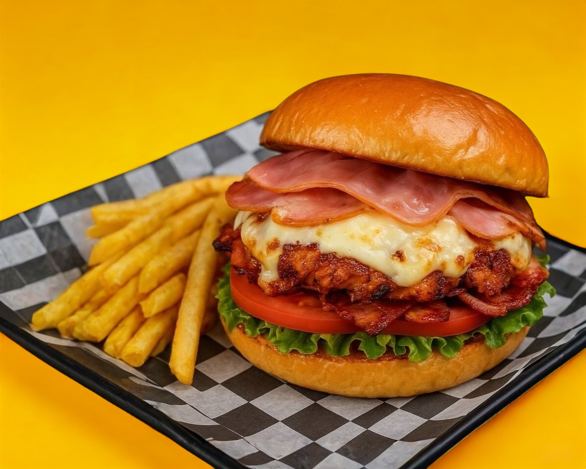 Hamburguesa bañada en queso cheedar amarillo fundido y coronado con crujientes trocitos de tocino. Potente, brillante y completamente irresistible.