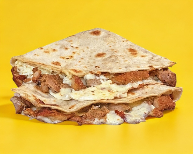 Taco grande de carne al pastor con queso en tortilla de harina
